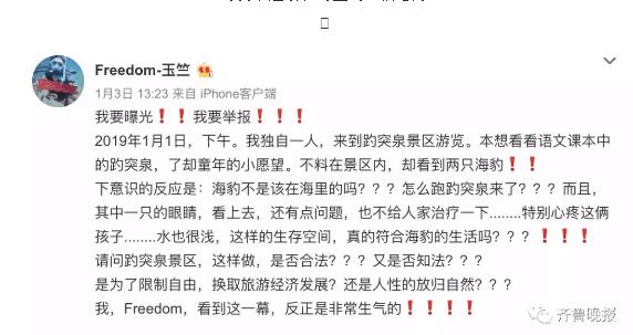 今年元旦,一名外地網友逛趵突泉時發現了海豹,便在微博上提出質疑并“舉報”:“海豹不是應該養在海里嗎?”“水也很淺,這樣的生存空間,真的符合海豹的生活嗎?”“趵突泉景區這樣做是否合法?”該微博轉載、評論和點贊數均較多,有的支持爆料網友,有的無所謂,還有的認為海豹的豹和趵突泉的趵同音,因風水而養海豹。