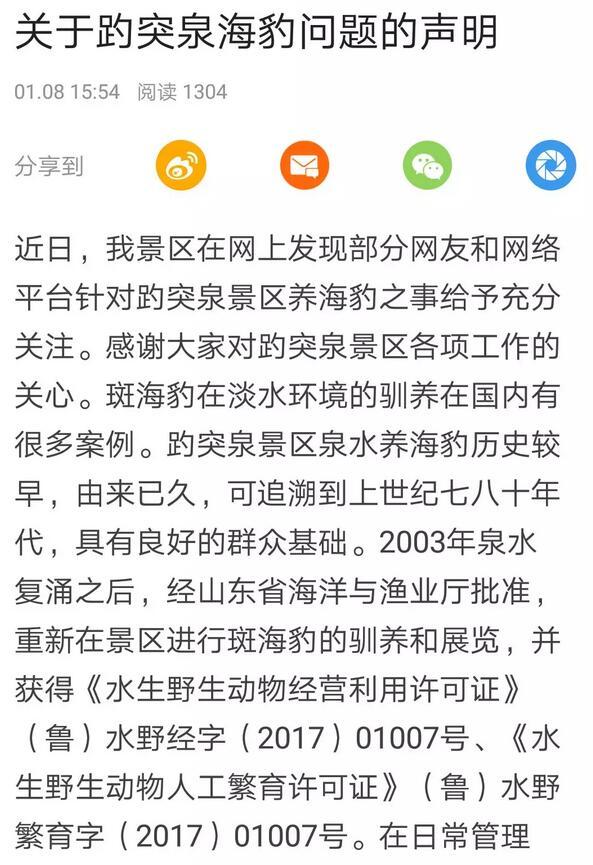 好在景區很快給了答復:“感謝大家對趵突泉景區各項工作的關心。斑海豹在淡水環境的馴養在國內有很多案例。趵突泉景區泉水養海豹歷史較早,由來已久,可追溯到上世紀七八十年代,具有良好的群眾基礎。”“獲得《水生野生動物經營利用許可證》(魯)水野經字(2017)01007號、《水生野生動物人工繁育許可證》(魯)水野繁育字(2017)01007號。”“景區專人負責海豹的喂養,食物以新鮮海魚為主”“在飼養過程中如發現海豹的異常表現,會第一時間請動物專家進行會診,對其進行積極治療,最大程度保證了健康安全的生活環境。”