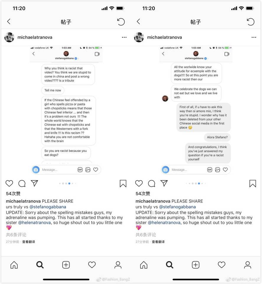 一位網友 @michaelatranov 跑到Instagram,質問Stefano Gabbana,最終引發了一場罵戰。在對話中,他稱呼中國為“Country of (shit) ”“無知骯臟惡臭匪幫”。