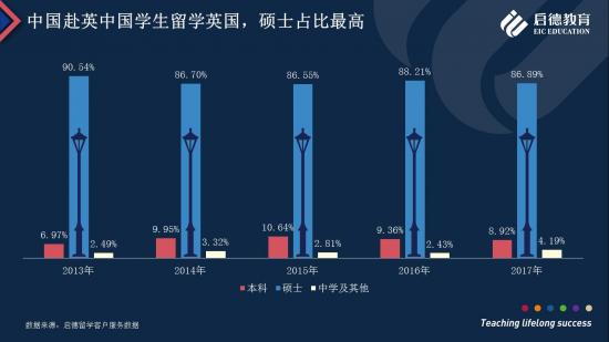 根據(jù)英國高等教育網(wǎng)HESA 的數(shù)據(jù)顯示自2013-2017年的四年時(shí)間,中國學(xué)生注冊接受英國高等教育的人數(shù)分別為87,895人、89,540人、91,215人、95,090人,年平均增幅約為8%。并且從2012-2013學(xué)年開始,中國已然成為非英國學(xué)生來英留學(xué)的第一生源地。