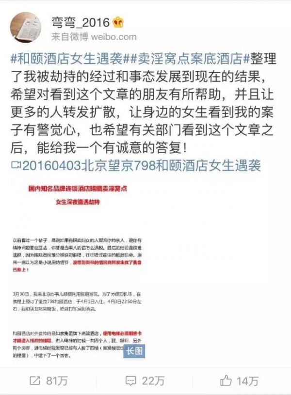 4月5日晚,ID為@彎彎_2016的女子聲稱在北京和頤酒店入住時遭遇陌生男子拖拽劫持,而酒店和警方都不作為,并暗指如家旗下的和頤酒店暗藏賣淫窩點。原微博的轉評已達上千萬。