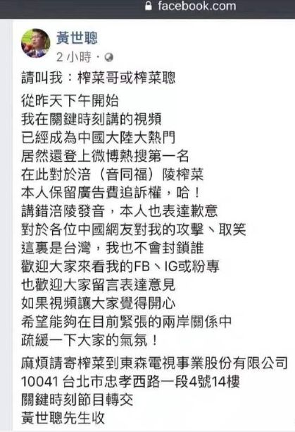 8月8日,嘉賓黃世聰在臺灣節目《關鍵時刻》上公開表達“pei陵榨菜股價大跌,說明中國大陸老百姓榨菜都吃不起”等言論,節目流傳至國內后引起熱議。隨后其更是在facebook上發布“我的視頻登上中國大陸微博熱搜第一名”、“對涪陵榨菜保留廣告費追訴權”,在結尾更是放上了地址,稱“麻煩請寄榨菜到XXX公司”。