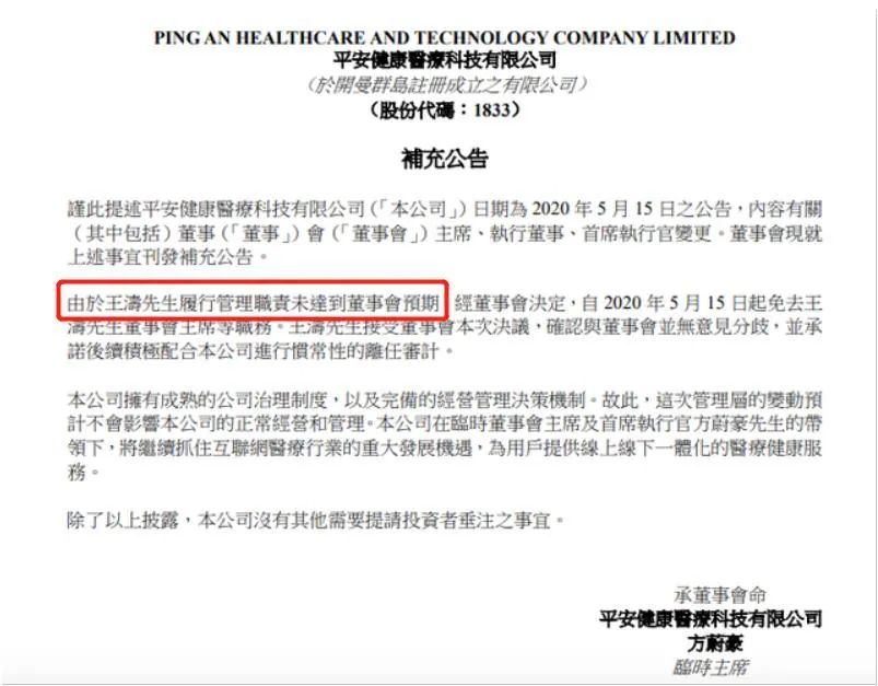 事實(shí)上早在四天前,也就是5月15日,平安好醫(yī)生就曾發(fā)布公告,聲稱(chēng)王濤是由于個(gè)人原因離職的。