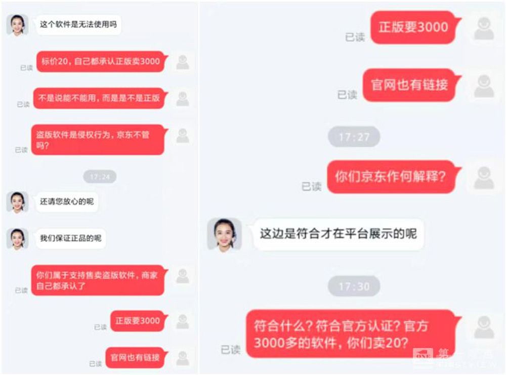 剛開(kāi)始京東人工客服還試圖利用“這個(gè)軟件是無(wú)法使用嗎”此類問(wèn)題轉(zhuǎn)移話題,同時(shí)在我們“盜版軟件是侵權(quán)行為,京東不管嗎?”的問(wèn)題不斷提問(wèn)下,也始終堅(jiān)持稱“我們保證正品的呢”,“這邊是符合才在平臺(tái)展示的呢”……