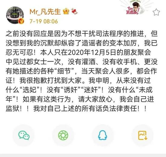 從應對速度看,距離“都美竹”發布第一篇爆料博文已經過去了11天,直到7月19日早晨,吳亦凡才對此事做出回應。