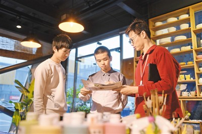 近年來,福建省福州市鼓勵臺灣青年在福州創業就業。目前,全市主要臺灣青年創就業平臺入駐臺灣青年企業347家,在榕創業就業臺灣青年逾4000人。圖為臺灣青年蕭國佑(右一)在福州市臺灣青年創業就業基地和同事討論產品策劃方案。